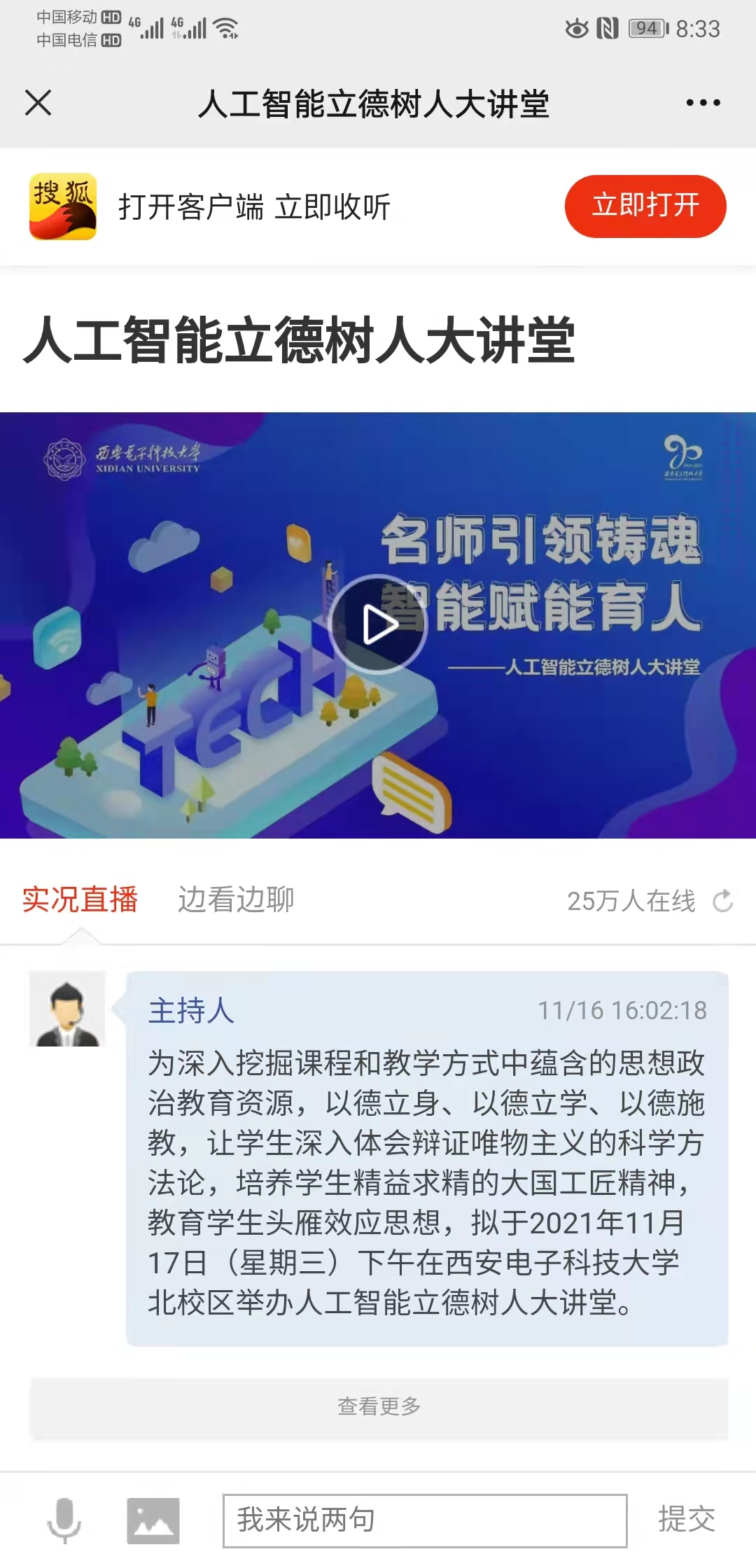 2021年11?17?,西安電?科技?學(xué)北校區(qū)舉辦??智能?德樹??講堂,線上同步進(jìn)?直播,吸引超68萬(wàn)?次在線觀看。