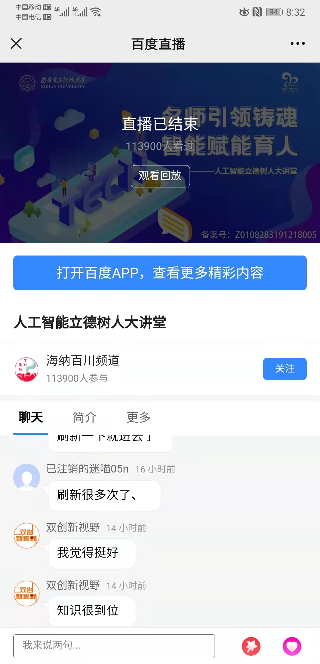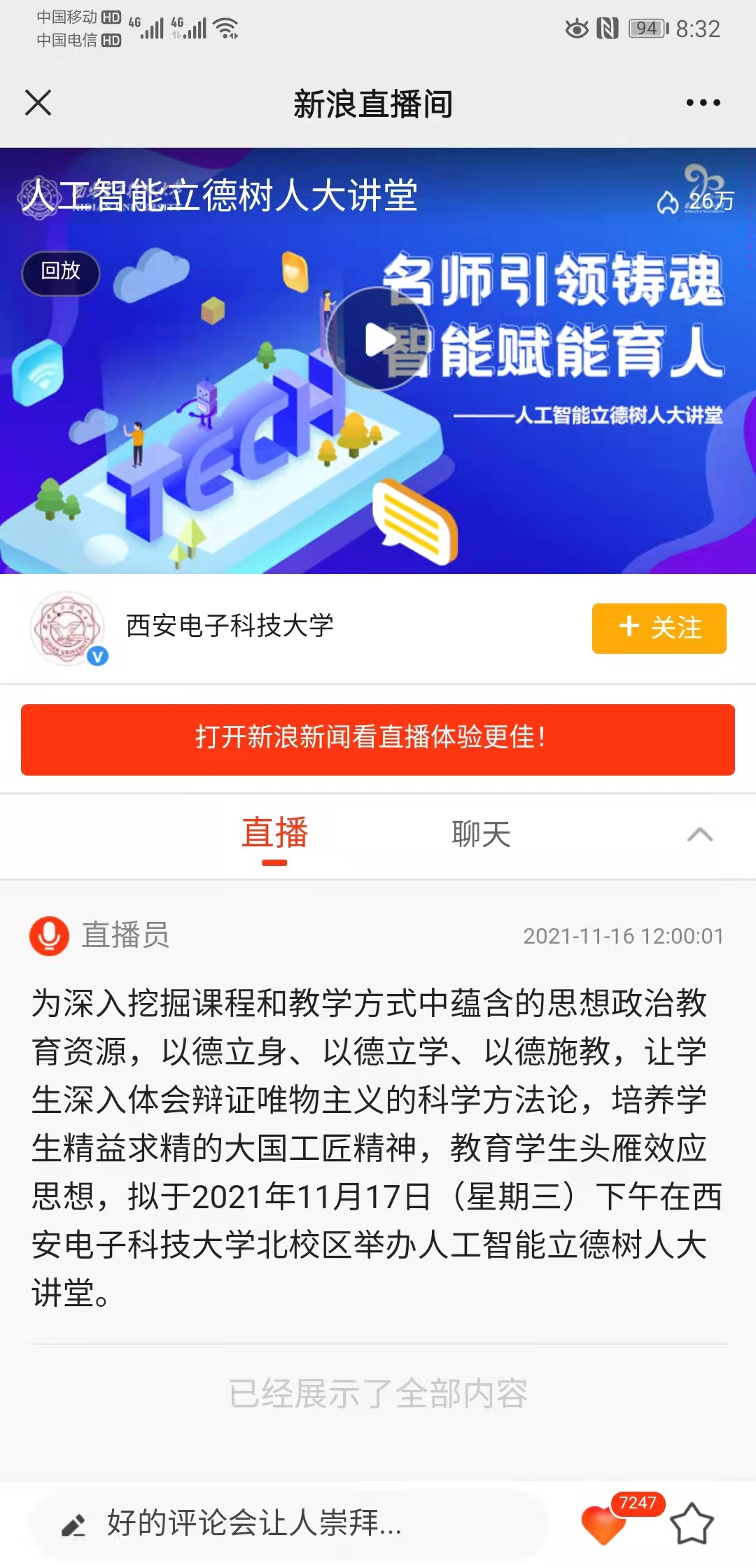 2021年11?17?,西安電?科技?學(xué)北校區(qū)舉辦??智能?德樹??講堂,線上同步進(jìn)?直播,吸引超68萬(wàn)?次在線觀看。